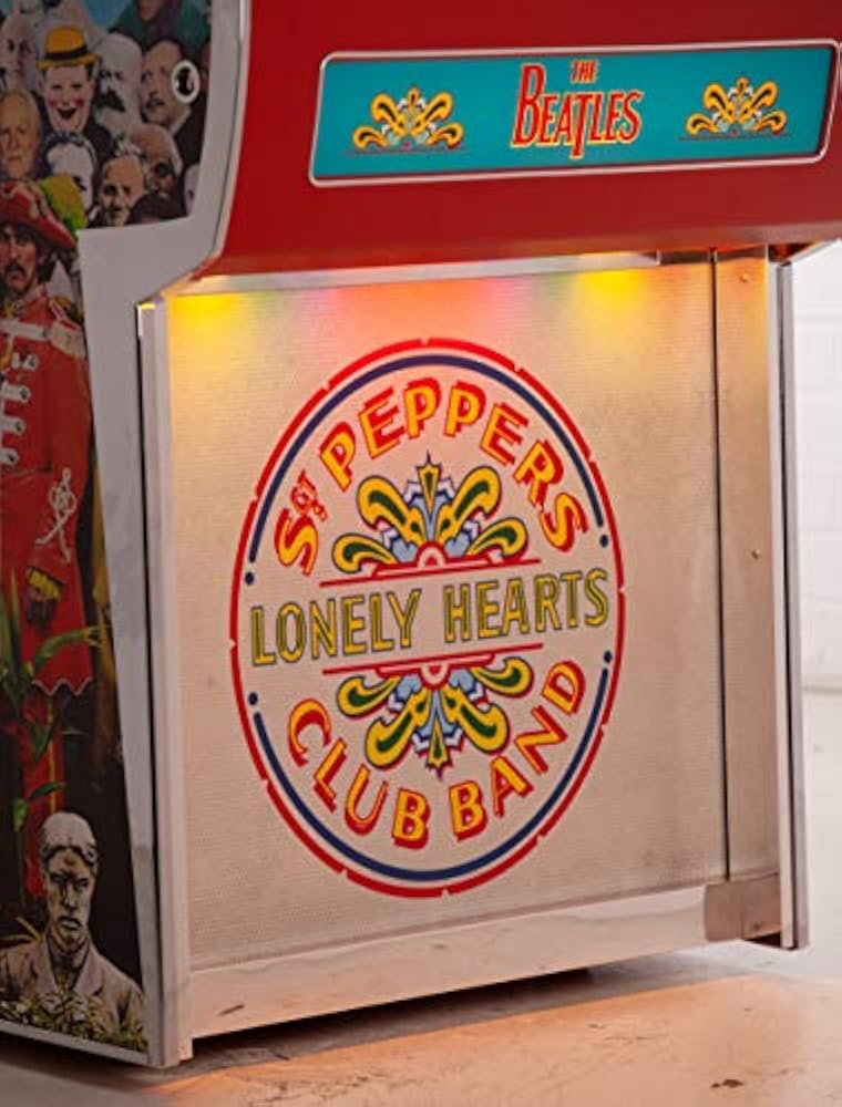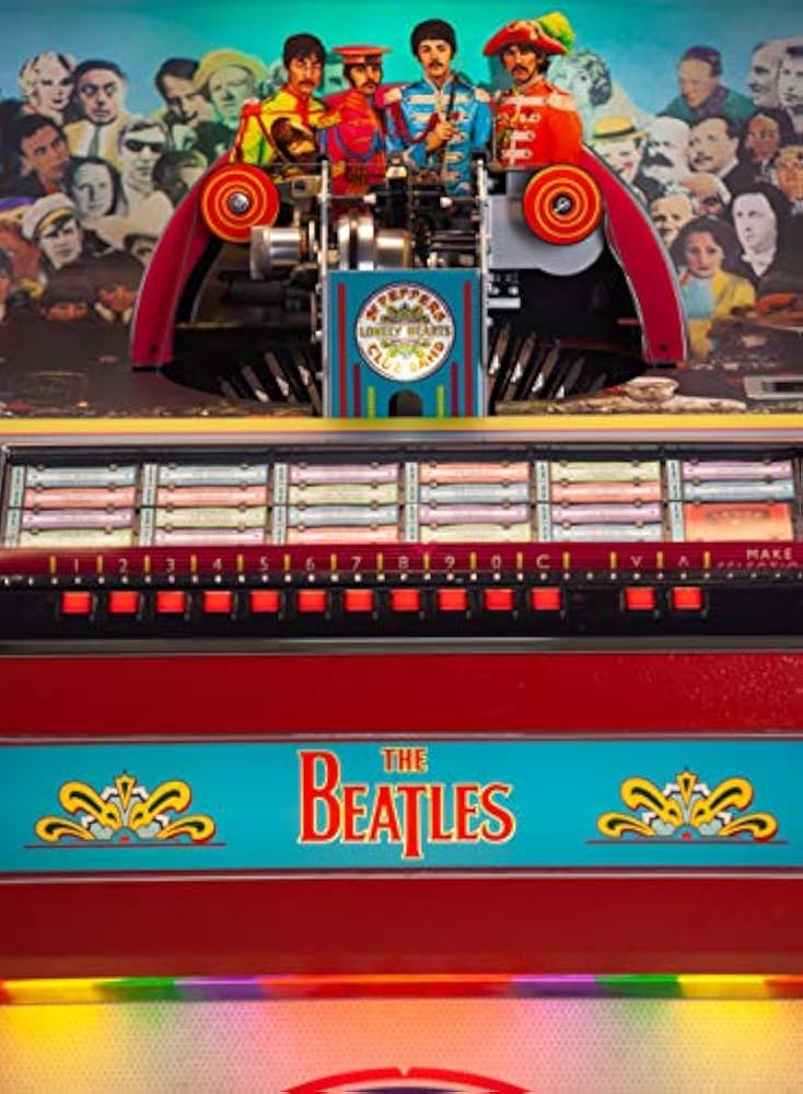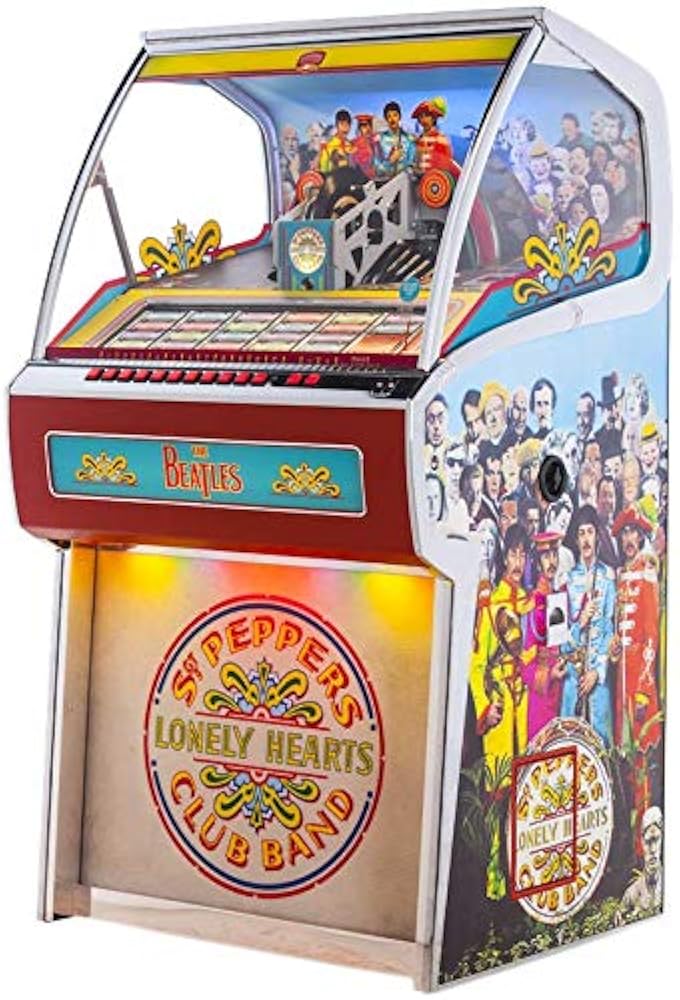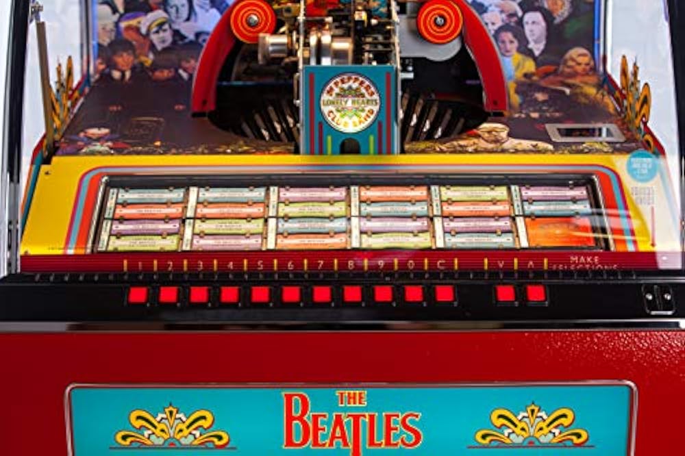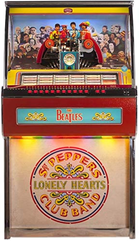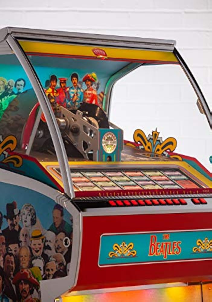 Crosley’s unique Vinyl Mechanism is the only vinyl jukebox mechanism being manufactured anywhere in the world. It holds seventy 7″ (45 RPM) records giving you the option to select the A or B side (140 selections). Sit back and watch as the psychedelic swirls spin to life alongside The Beatles in all their Sgt. Peppers uniformed splendor. The revolving title rack allows easy access to your favorite records and custom software gives you a quick and easy way to create and print your own jukebox labels. Track selections can be made directly from the jukebox button bank or via the infra-red remote control which also offers control of the volume, reject, shuffle mode, and lighting controls. And since tech has come a long way since the release of Sgt. Peppers, you now have the option of using the Bluetooth receiver to stream any of your digital music through the jukebox speakers.