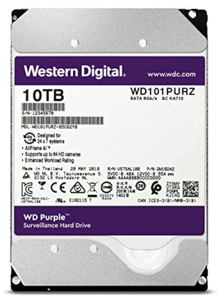 WD Purple drives are built for 24/7, always-on, high-definition security systems. WD Purple surveillance storage feature Western digital’s exclusive all Frame technology, so you can confidently create a security system tailored to the needs of your business. Using all Frame technology, WD Purple drives improve video capturing and helps to reduce errors, pixilation, and video interruptions that could happen in a video recorder system. WD Purple drives have an enhanced workload rating that supports systems designed for 24×7 video recording with up to 64 cameras. Compatible with: PC