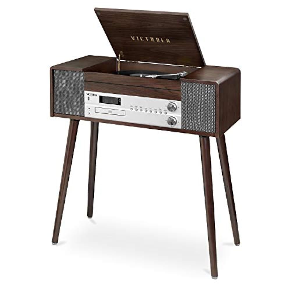 El reproductor de grabación de madera Victrola Jackson 7 en 1 con Bluetooth tiene todas las características que puedes desear en una mesa giratoria: 3 velocidades, USB y reproductor de CD, conectividad Bluetooth, radio FM, altavoces integrados y un conector auxiliar. Su diseño elegante pero envejecido funciona perfectamente en cualquier espacio de vida u oficina.