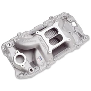 The Edelbrock Performer Intake Manifold is a dual-plane, low-rise intake manifold with a 180 degree firing order and a patented runner design that delivers outstanding performance. This patented design greatly improves torque over a wide RPM range, especially off-idle through 5,500 RPM. It provides crisp throttle response over stock intakes. With this new manifold, rudders can take advantage of the higher flow available with the Vortec head design. It has provisions for external water bypass. It accepts late model water neck, alternator, HEI and air conditioning but will not accept stock automotive carburetors or 262 TBI unit.
