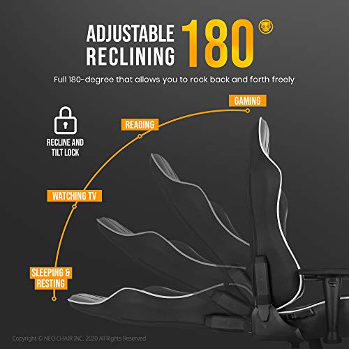 Más que una silla de juego: reclinable 180° y bloqueo (aka. Función “puede-hacer-esto”). 90° de trabajo/130° de relajación/160° viendo una película. Silla de oficina reclinable de 180°. Función de inclinación y bloqueo para esta silla de oficina ergonómica. Fácil ajuste con palanca conveniente. Disfruta de juegos con silla reclinable para juegos.
