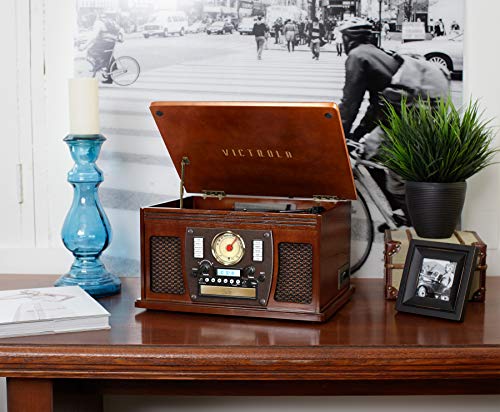 El tocadiscos retro de 3 velocidades gira su vinilo favorito de 33 1/3, 45 y 78 RPM al tiempo que incorpora una calidad de sonido incomparable a través de los altavoces estéreo incorporados y la capacidad inalámbrica Bluetooth. Este tocadiscos ofrece una experiencia auditiva impresionante, mientras que la artesanía distintiva y la construcción clásica de madera real tienen la apariencia de una antigüedad transmitida de generaciones anteriores. Sube el volumen de tu álbum favorito y relájate mientras disfrutas del sonido puro de una Victrola.