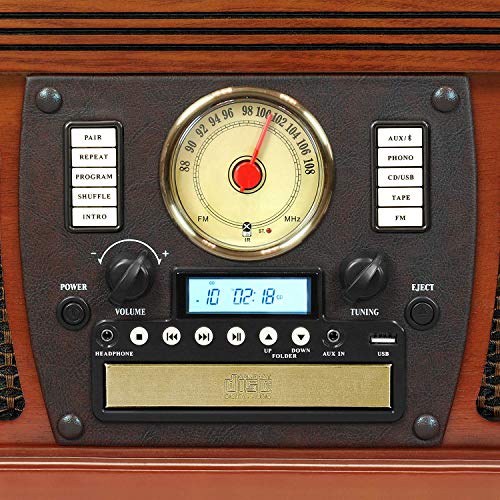 Este sistema de entretenimiento premium incluye Bluetooth incorporado para reproducir música de forma inalámbrica desde su dispositivo habilitado para Bluetooth y la capacidad de grabar desde vinilo a MP3 (software para Mac / PC y cable USB incluidos). Características adicionales: reproducción USB, reproductor de CD y cassette, radio FM con un dial giratorio nostálgico, conector auxiliar de 3,5 mm para reproducir música desde cualquier dispositivo que no sea Bluetooth, conector para auriculares y conectores RCA. Versión de Bluetooth: V2. 1 + EDR; Perfiles de Bluetooth: A2DP, AVRCP.