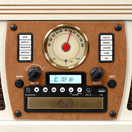 Reproductor de CD integrado, reproductor de casete y radio AM/FM con sintonizador giratorio de moda antigua. Incluye mando a distancia de función completa y altavoces estéreo.