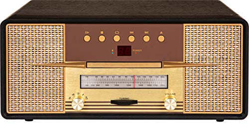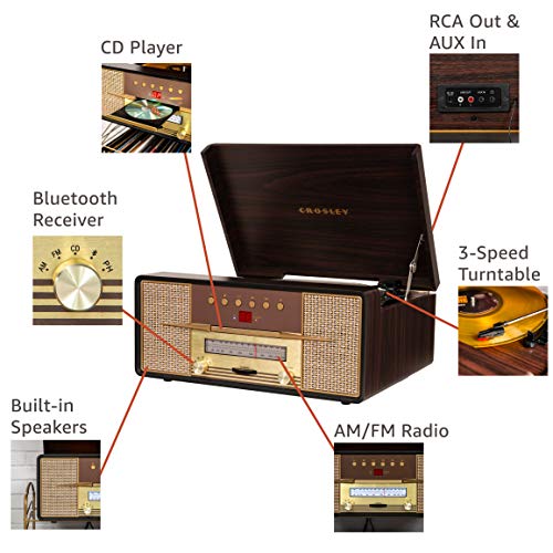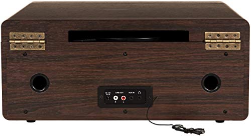 Equipado con un tocadiscos de 3 velocidades, receptor Bluetooth, radio AM/FM, reproductor de CD y entrada auxiliar