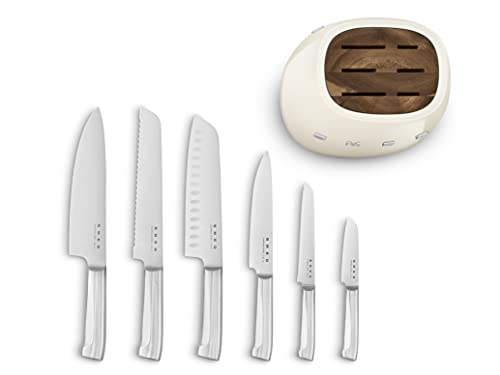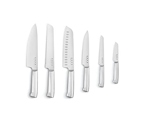 El juego incluye: cuchillo de verduras de 3 pulgadas, cuchillo de utilidad de 5 pulgadas, cuchillo de carne de 5.9 pulgadas, cuchillo Santoku de 7 pulgadas, cuchillo de pan de 7.48 pulgadas, cuchillo de chef de 7.48 pulgadas y bloque de cuchillos de madera de acacia de 6 ranuras