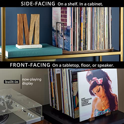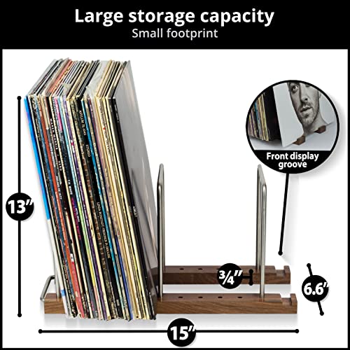 Hecho para durar, organizador de almacenamiento de vinilo de alta calidad hecho de madera maciza de nogal y acero inoxidable; soporte de disco de vinilo integrado en la parte delantera y un mango de soporte trasero para que puedas reposicionar el soporte del álbum de discos cuando esté lleno. Coincide con la capacidad LP de un típico soporte de tocadiscos