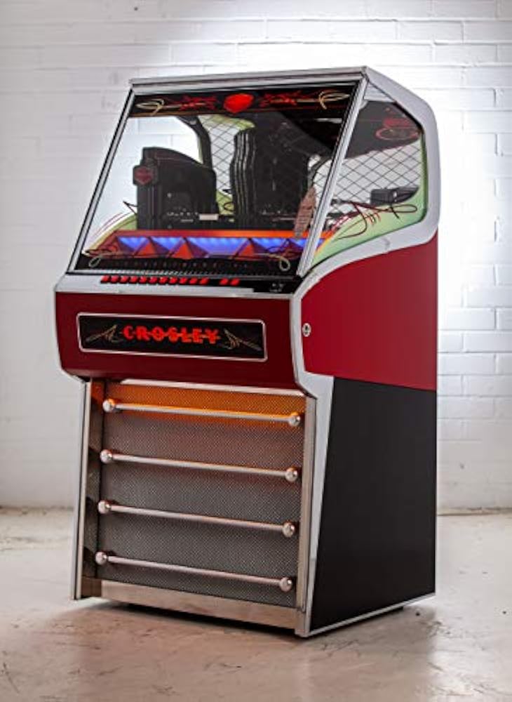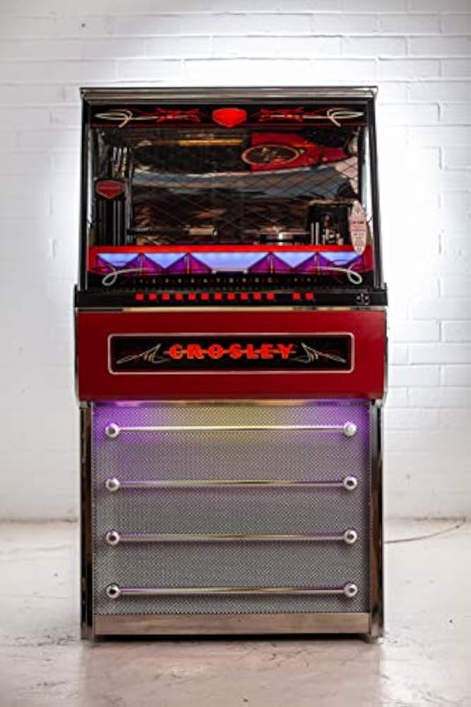 In celebration of the 70th anniversary of the LP record, Crosley is pleased to announce the Long Player vinyl jukebox. A jukebox designed to champion the LP Album! The truly beautiful retro styled jukebox, hand-built by dedicated craftsmen and women encapsulates the golden age of Rock and Roll. The hypnotic visible LP mechanism and movement are housed in an unmistakably 50s styled cabinet, and embellished with high quality chrome fittings. The jukebox holds 10 LPs, and both the full ‘A’ and ‘B’ sides can be played in the order selected. Watch how the beautifully designed and manufactured “arm” carefully selects the vinyl by the sides and flips it with care while delivering to the turntable. Once on the turntable, the accurately balanced tone arm delivers the joy of your favorite albums directly through the renowned D4 amplifier and out through the specially designed speaker cabinet. This stunning jukebox also features a built in Bluetooth receiver to allow audio streaming from any compatible device. Please note that a coin mechanism cannot be fitted to this jukebox.